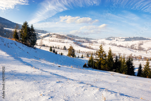 rolling landscape of a mountainous carpathian countryside in winter. fir trees on a snow covered hills and distant rural fields. frosty weather on a sunny day with clouds on a blue sky