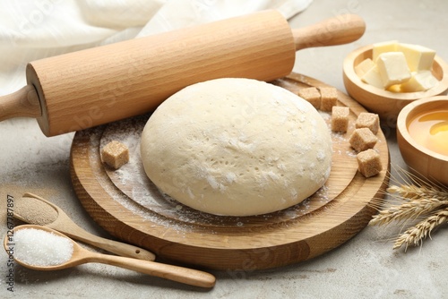 Rolling pin and different ingredients on light table, closeup