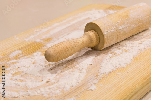 Rolling pin with flour on a wooden table . Close up