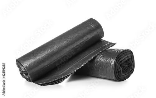 Rolls of black garbage bags on white background