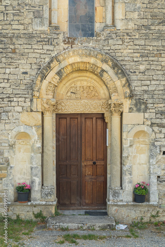 Romanesque Portal of Sainte Jalle Church in Drome, France, Showing Intricate Stone Carvings and Wooden Door