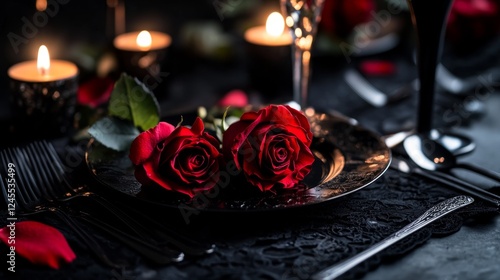 Romantic Dark Valentine Theme with Red Roses and Black Lace Setting