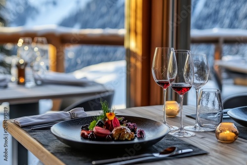 Romantic dinner overlooking snowy winter mountains.