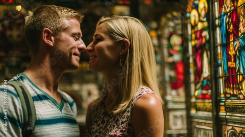 romantic illustration of a couple posing for a photo, with the ornate stained-glass window of a Christian church creating a vibrant, colorful backdrop. Their faces are softly illuminated by
