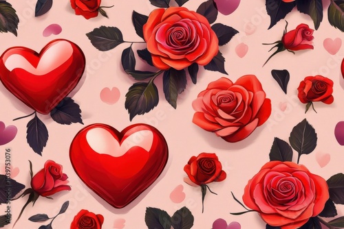 Romantic seamless pattern featuring red roses and hearts, perfect for valentine's day designs