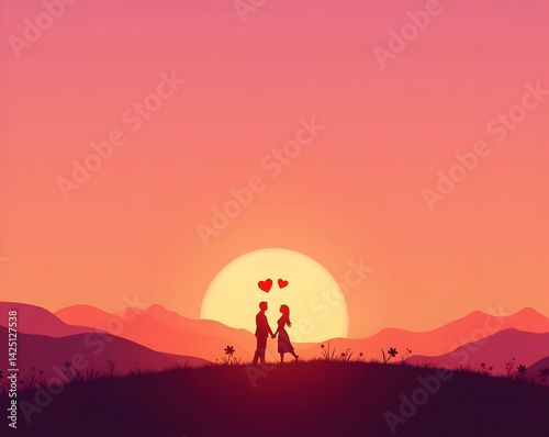 Romantic Sunset, Silhouette of Couple Holding Hands with Hearts Over Head on Hilltop with Gradient Pink and Orange Sunrise Background Illustration