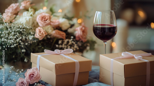 Romantic Valentine's Day setting with gifts, wine, and flowers in a cozy atmosphere