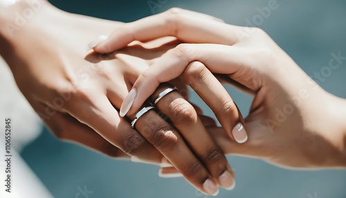 Romantic wedding hands in hands, silver rings promise forever.