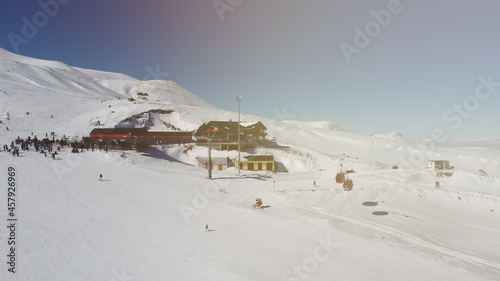 Ropeway on the slope of Erciyes mount. Snow covered top of Erciyes stratovolcano. Aerial view of Erciyes ski resort, Kayseri, Turkey