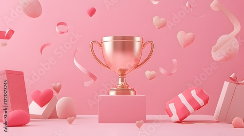 Rose Gold Trophy Surrounded By Pink Hearts and Gifts