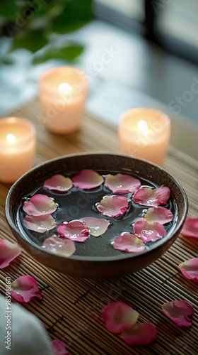 Rose Petals and Candles Spa Bowl Water. Wellness Relaxation. Aromatherapy. Scented Essential Oils.