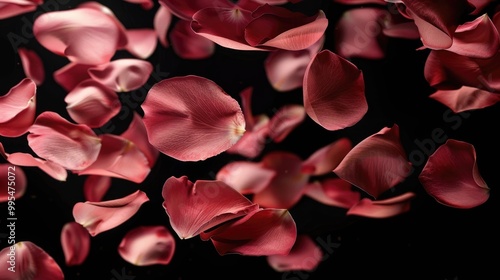 Rose petals in motion on black backdrop Realistic abstract flower background