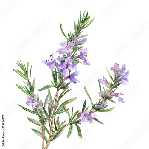 Rosemary Herb Branch with Purple Flowers Isolated without Background.
