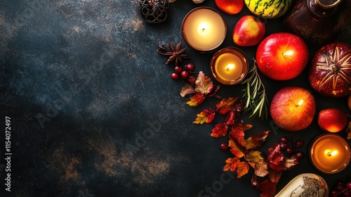 Rosh Hashanah celebration traditional symbols and autumn elements arranged on dark background with copy space for holiday themes