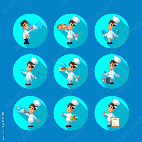 Round flat vector icon set with cook and kitchenware