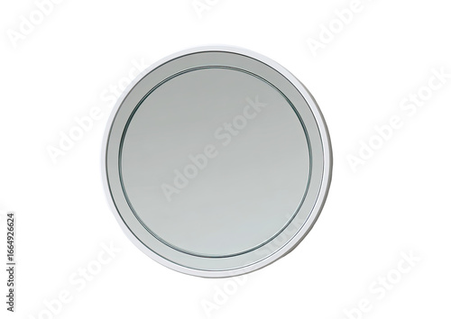 Round wall mirror with a simple, light gray reflective surface and a thin white border