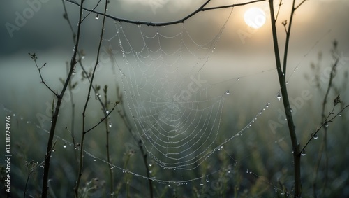 Round web on plants in a field illuminated by the foggy morning sun. Selective focus.