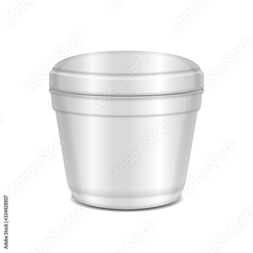 Round white plastic closed container. Soup bowl or for dairy products, yogurt, cream, dessert, jam. Vector packaging mockup template