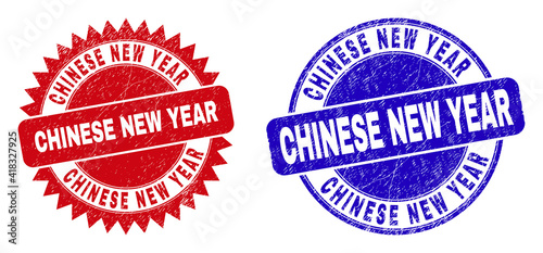 Rounded and rosette CHINESE NEW YEAR seal stamps. Flat vector grunge seal stamps with CHINESE NEW YEAR text inside round and sharp rosette shape, in red and blue colors.