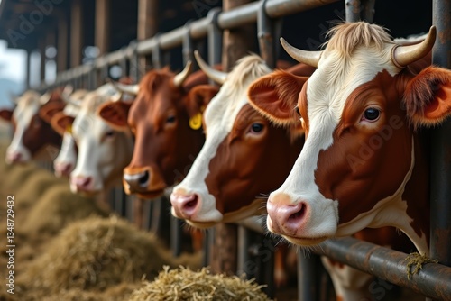 Row of dairy cows with horns feeding on hay inside a modern cattle farm, highlighting livestock farming, dairy industry, agriculture, and sustainable food production