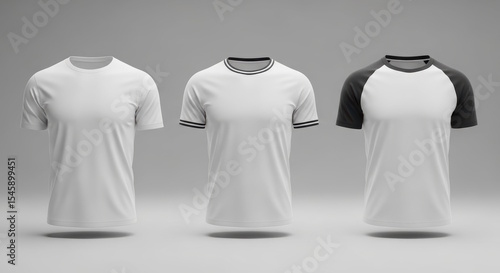 Row of three white t-shirts in different styles against a grey background, perfect for showcasing designs or apparel