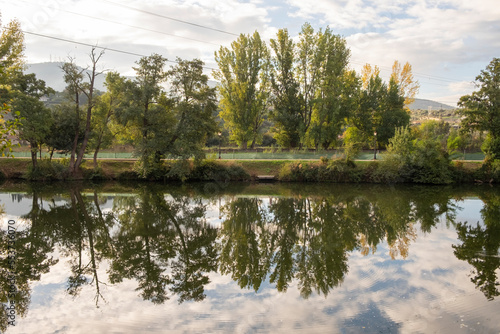 Row of trees of the poplar class reflecting in the water.