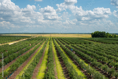 Rows of cultivated organic blueberry trees or shrubs on a large commercial farm. The rows of sweet blueberry bushes have grass patches between the tall fruit trees. The sky is blue with clouds.