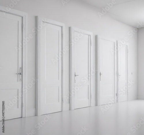 Rows of pristine white doors, open and closed, against a stark white backdrop , lines, vertical, perspective