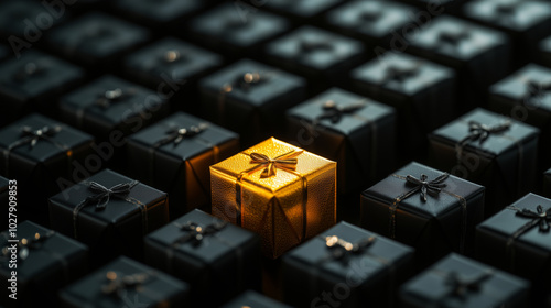 Rows of small black gift boxes, with one golden box standing out to represent a special Black Friday deal. Black Friday concept, copy space