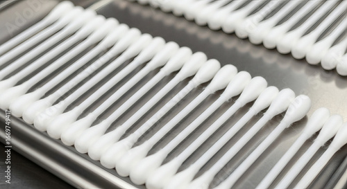 Rows of sterile white cotton swabs neatly arranged on a metallic tray, ready for use in a medical or laboratory setting.