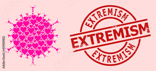 Rubber Extremism stamp seal, and pink love heart collage for flu virus. Red round stamp seal contains Extremism caption inside circle. Flu virus mosaic is organized from pink amour symbols.