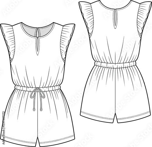 Ruffle sleeve, short romper, drawstring waist, front and back view, fashion flat, cad sketch, vector outline, technical design