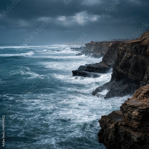Rugged coastline meets a churning sea under a dramatic, stormy sky