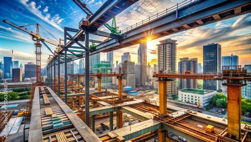 Rugged steel beams rise above a bustling urban landscape as cranes and excavators transform the cityscape amidst a sea of concrete and scaffolding.