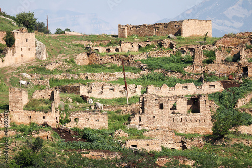 ruined stone houses of abandoned village Kurib in the mountains of Dagestan, Russia