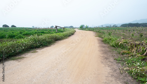 Rural dirt road and grass on both sides of the road. Path in rural fields.