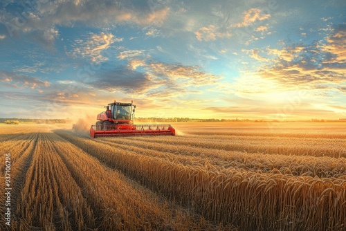 Rural harvest scene showing a harvester working in the wheat field with red and white machinery colors