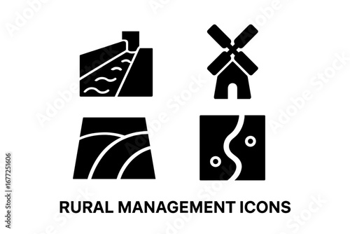 Rural management icon set. Solid glyph vector symbols for agriculture, farming, and land resources. Includes irrigation channel, windmill, crop fields, and topographic map.