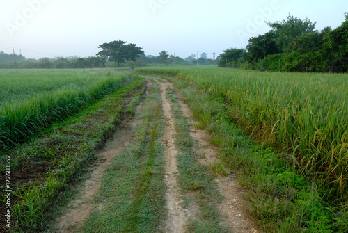rural road through green fields and cloudy sky, Thailand.