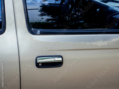 Rust and paint damage on part of the old car body. Peeling off old paint on the car body