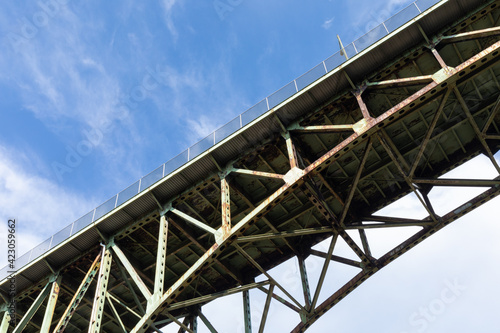 Rusted underside of an arch bridge, decaying infrastructure, blue sky with clouds, horizontal aspect