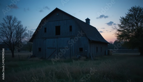 Rustic Barn at Dusk with Calm Sky and Surrounding Nature Landscape
