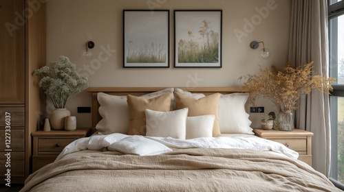 Rustic bedside cabinet near bed with beige pillows. Farmhouse interior design of modern bedroom.