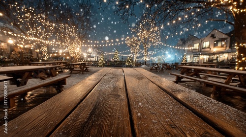Rustic Outdoor Winter Scene with Snow and String Lights at Night