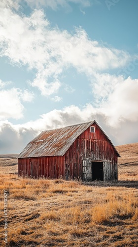 Rustic Red Barn Surrounded by Golden Grass Under Blue Sky