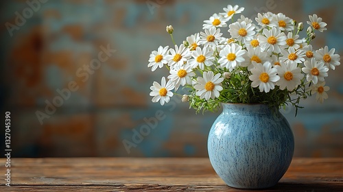 Rustic Still Life Delicate White Daisies in a Blue Vase on Wooden Table