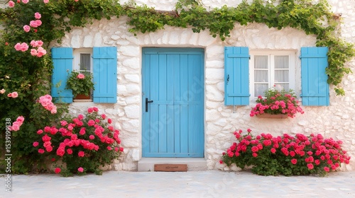 Rustic stone house with blue door and pink wall, romantic garden with roses and bougainvillea, Mediterranean village entrance, dreamy floral scenery