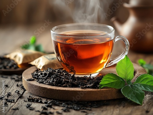 Rustic wooden background with a glass cup of black tea, dry tea bags, and scattered tea leaves, selective focus, warm and soothing tea aesthetic