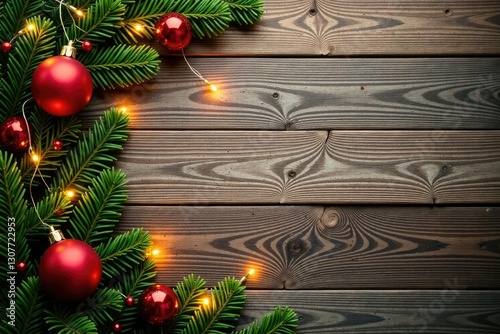 Rustic wooden background with Christmas decor, lights, festive