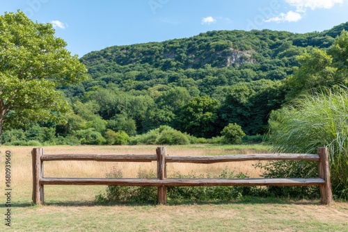 Rustic wooden bench in a park setting. Lush green hills